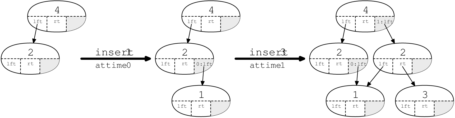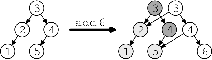 Figure 2 shows an example of path copying on a binary search tree. Making a modification creates a new root, but we keep the old root around for later use; it's shown in dark grey. Note that the old and new trees share some structure (light grey nodes).