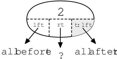 With this algorithm, given any time \(t\), at most one modification box exists in the data structure with time \(t\). Thus, a modification at time \(t\) splits the tree into three parts: one part contains the data from before time \(t\), one part contains the data from after time \(t\), and one part was unaffected by the modification.