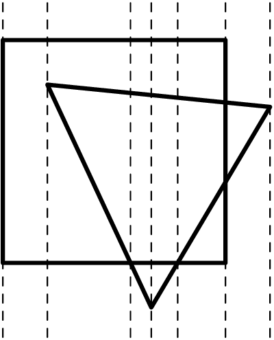 To solve the problem in two dimensions, break the plane into vertical slices at each vertex or point where lines cross. These slices are interesting because crossovers don't happen inside slices: inside each slice, the dividing lines between regions appear in a fixed order, so the problem reduces to the linear case and requires a binary search (plus a bit of linear algebra). Figure 1 shows an example of how these slices look. To locate a point, first find the vertical slice it is in with a search on the point's x coordinate, and then, within that slice, find the region it is in with a search on the point's y coordinate (plus algebra). To do two binary searches takes only \(O(\log n)\) time, so we can locate a point in \( O(\log n)\) time. However, setting up the trees for searching a figure with \(n\) vertices will require \(n\) different trees, and each tree will take \(O(n\log n)\) time for sorting, so in total it takes \(O(n^2 \log n)\) time and \(O(n^2)\) space to do the preprocessing.